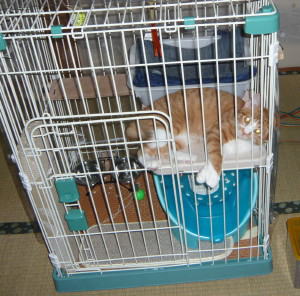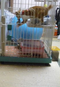 茶太郎はケージの中で暴れまくりです。ケージの外側にトイレ用の砂が巻き散らかされているのがわかりますか? 中であまりの暴れるので、食器はもちろんのこと、トイレもときどきひっくりかえっています。 |