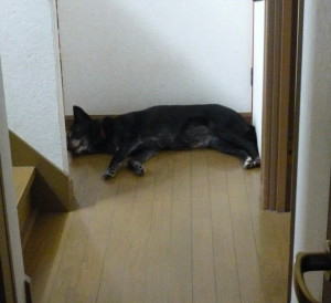 蒸し暑いので、いつものように廊下の奥でゴロンとしています。夜中に起きてきたお父さんは、私に気がつかずに踏んで行きました。
