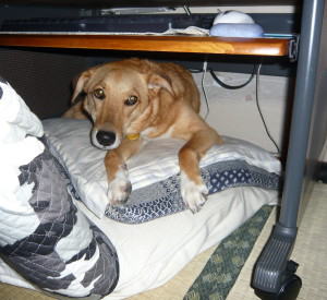 マリーは工事のときから、変な音がするので怖がっていました。昨日の晩も、変な音がしたのでしょう。パソコンデスクの下で寝ていました。