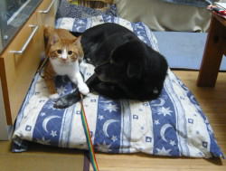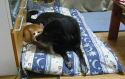 私とマリーは小豆と茶太を呆れて見ています。もっとも、マリーは見ているようですが、私はアホくさくてほっといています。お布団が気持ちいいです。 |