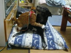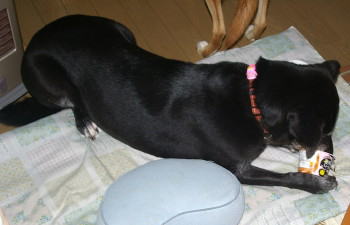 茶太のベッドは穴に落ちかけています。茶太は少しはしゃぎすぎ。 |