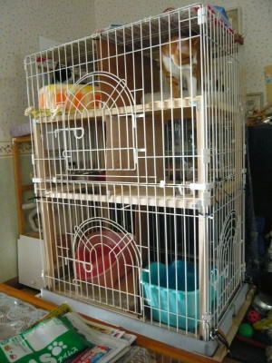 小豆と茶太の新しいケージです。中は、3階建てで、小豆用(左側)と茶太用(右側)に区切ってあります。1階がトイレと爪とぎ用、2階が食事、3階が寝るところです。小豆も茶太も満足しています。 |