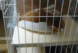 この階にも真中に仕切りがあるのですが、実は上の方が開いていて、隣の様子を見ることが出います。茶太はいつもその隙間から小豆に向かって手を出しています。小豆は、茶太が来られないのがわかっているのか、一切無視しています。 |