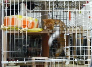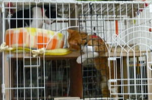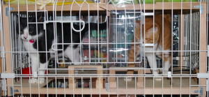 小豆と茶太が隣どうしに住むようになって、茶太が小豆にちょっかいを出す回数が増えています。二人の間は、仕切ってあるのですが、茶太がケージの檻越しに手を伸ばしていきます。で伸ばした手は小豆に猫パンチされています。