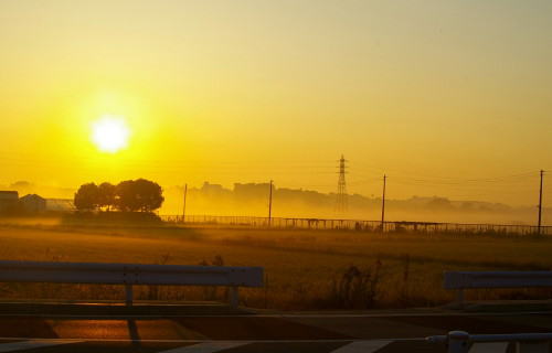 朝早く起きて散歩コースの方に向かうと、向こうの方に霧がかかっています。どうやらお父さんはこの様子を写真に撮りたかったようです。ちょうど、お日様が出たところで、木の向こうに私たちのいつもの散歩コースがあります。今日は、凛として気持ちのいい朝です。 |