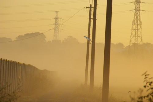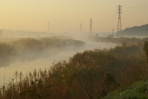 土手の上に着きました。どうやら霧はこの川から出ているようです。この川で時々カワセミを見かけるのですよ。 |