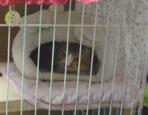 ニャンコ達には、ベッドの代わりにウサギのドームになりました。お母さんたちはこれを白いので「かまくら」と呼んでいます。茶太にとっては初めてでうれしいらしく、「かまくら」の中から顔を出しています。 |