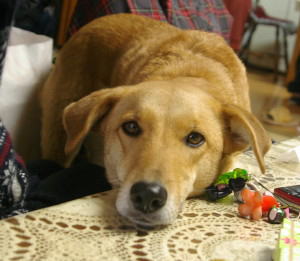 おじいさんちには、お母さんの弟のおじさん一家もやってきました。本当はおじさんちで飼ってるウサギさんも一緒に来てほしかったのですが、お留守番のようです。来れば私たちみんなで遊んであげようと思います。 さて、たくさんの人が私のことを呼びます。私はうれしくて尻尾をふります。でも、変なにおいがします。尻尾を振りすぎて、ストーブに当たってしまいました。尻尾の先の毛が少し縮れてしまいました。
