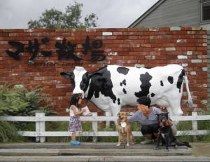 ←(上) マザー牧場の入り口に牛さんがいました。女の子と仲良しになって写真を撮りました。