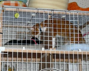 茶太は真ん中の仕切りを体が通るくらいまで大きくしてしまいました。上から覗き込んでは小豆をなめたり、手で尻尾を触ったりしています。小豆のところに行きたいのですが、なかなか壁は乗り越えられないようです