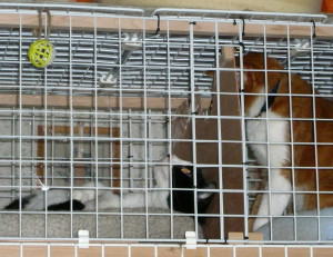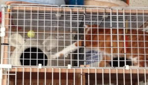 小豆と茶太の間には仕切り板が入っているのですが、茶太が破壊していって、今では顔が通る大きさになりました。