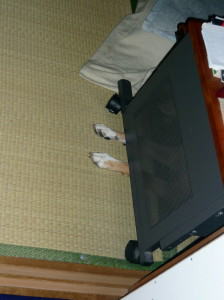 ここのところ、雷は多かったので、マリーは相変わらず逃げ回っています。先日、マリーがいないので探していると、パソコン机の下から手だけが出ていました。