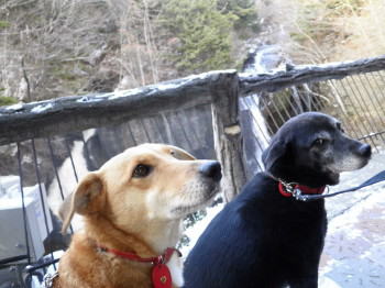 車から出されたら周りは雪景色。竜頭の滝で写真を撮るのはいいのだけれど、マリーはかわいそうにガタガタ震えています。私はマリーよりは毛がありますが、それでも寒かった。 |