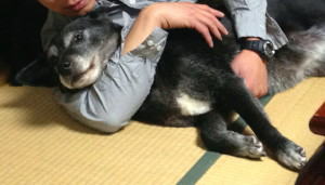 おばあさんのおうちでは畳の部屋に入れてもらえたのはいいのだけれど、酔っ払いのお兄さんにつかまってしまいました。なでて貰えるのはうれしいのだけれど−−−。 |