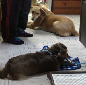 手前のワンコがクー君です。お母さんが私のおもちゃをあげたようで、夢中になっています。マリーが不思議そうに眺めています |