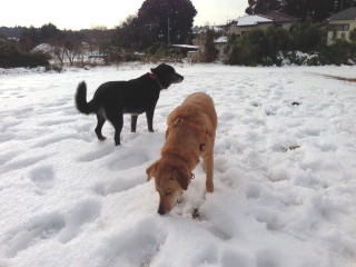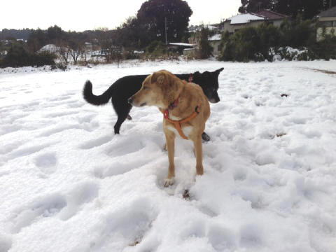 16日はやっと散歩に行けるようになりました。雪の原を見て興奮した私は、走り回り、まだおどおどしているマリーを雪の中に引き倒しながらはしゃいでいました。 |