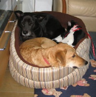 大きなベッドの中で寝ています。もともと、私とマリーの ために買ってもらったので、マリーと寝ているところに小豆も入ってきました。↓)