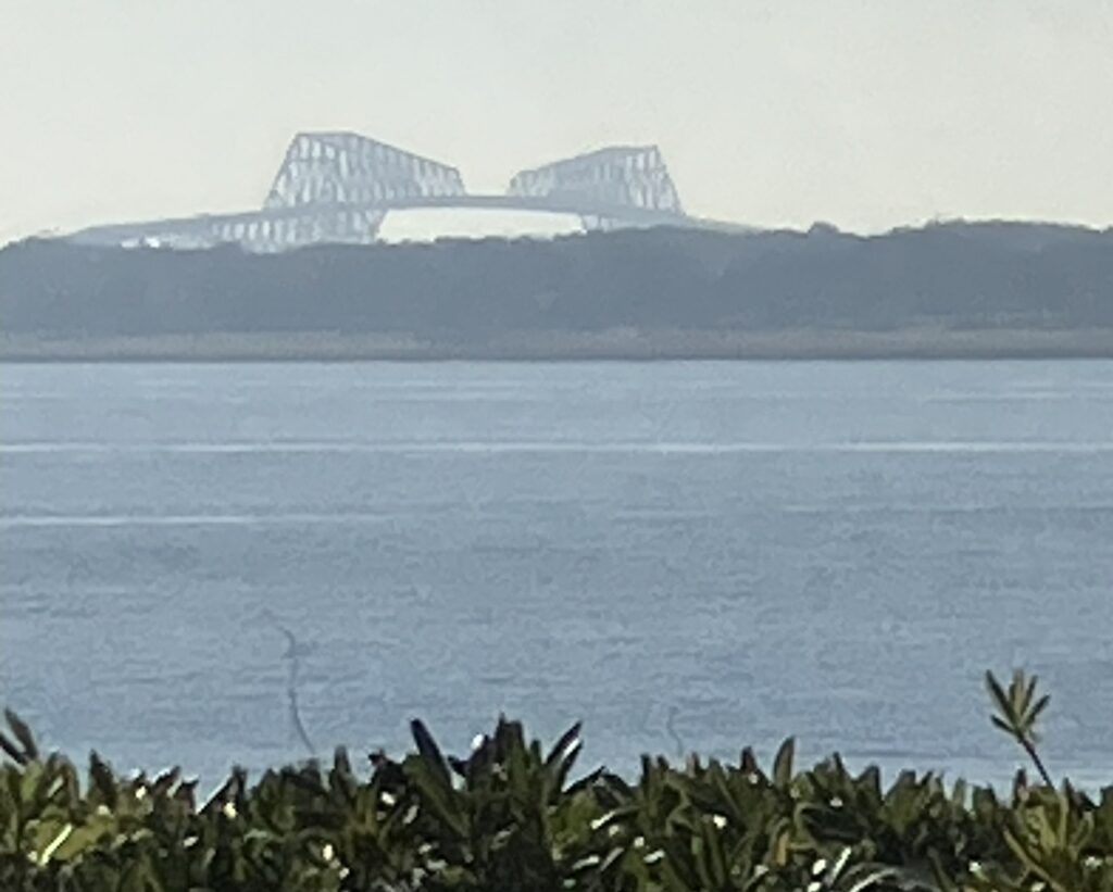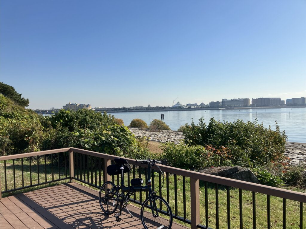 西側の端からは東京ゲートブリッジが見えます。葛西臨海公園は結構広い公園で森の中の小道もあり自転車で回っても割と時間がかかりました。葛西海浜公園の入り口の渚橋(ここは自転車通行不可でした)を江戸川サイクリングロードの起点としてスタートです。公園の海岸沿いを走っていると、川向こうにディズニーランドが見えます。