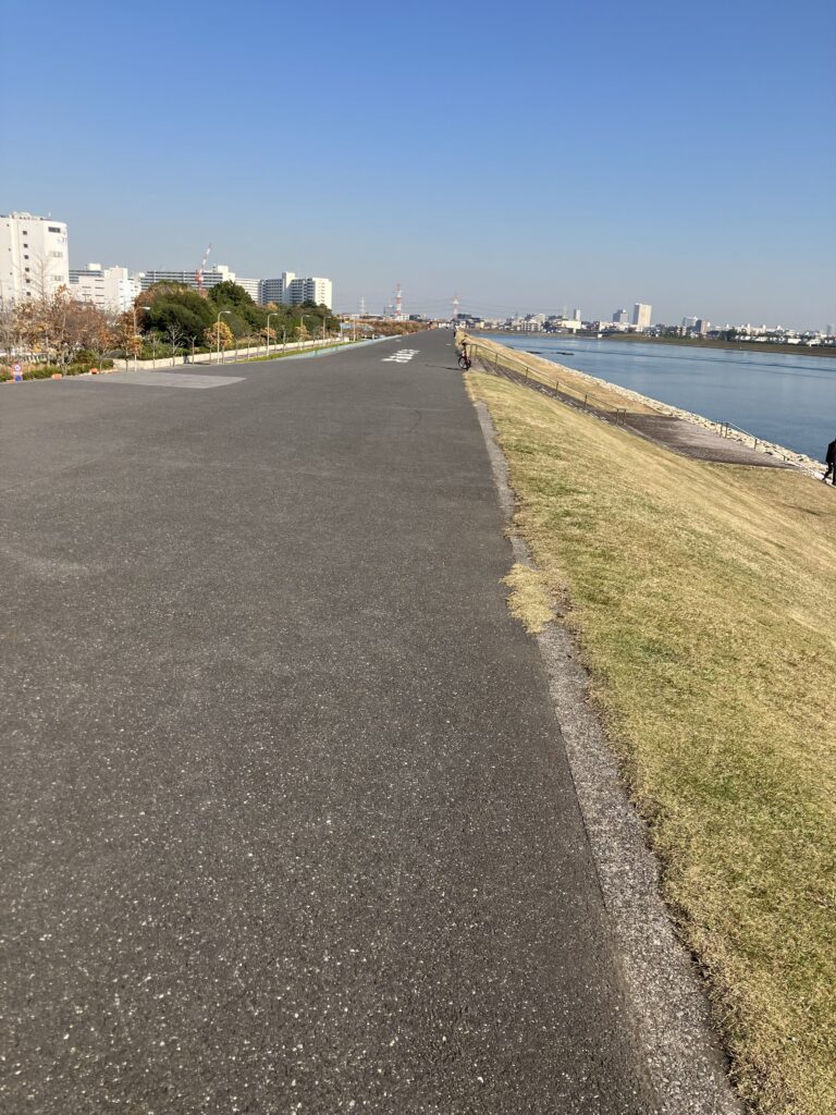 サイクリングロードに入ると堤防の上に舗装された道が続きます。